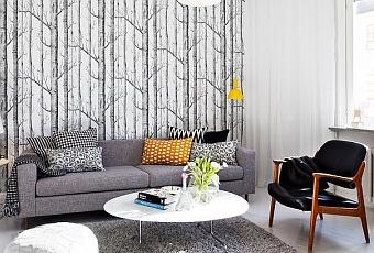Me encanta el estilo retro danés de este apartamento y ¿qué me decís del papel de pared de árboles (abedules) de Cole & Son que tanto hemos visto en viviendas nórdicas? precioso!! es sin duda la estrella del salón junto a ese aparador de madera de nogal de aire retro o ‘mid century modern’. El apartamento está lleno de detalles a copiar, desde las composiciones con velas y cuadros en el salón, hasta las del dormitorio o el ingenioso espacio de oficina que han conseguido en el pasillo.