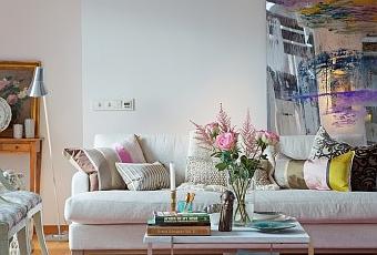 Preciosa la distribución de luz natural, gracias a ventanas y tragaluces en el techo, y la de espacios en este ático, con detalles naturales como el suelo de madera de roble, las vigas de madera en el techo alto blanco que lo hacen muy acogedor. A pesar tener una decoración algo recargada para mi gusto de accesorios y mobiliario (hay zonas que me recuerdan a esas casas de revista con las flores, libros de arquitectura y portavelas perfectamente colocados… ya me entendéis :O) , este ático tiene rincones como el del sofá con el cuadro abstracto detrás y los cojines de diferentes texturas y colores que están llenos de estilo y muy bien pensados. Lo que no me gusta nada de nada :S son las estructuras de las camas forradas de tela en los dormitorios, a pesar de ser unas preciosas habitaciones amplias y muy luminosas. Feliz lunes, disfrutad!