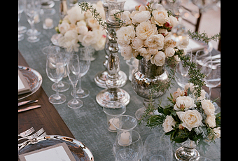 Todos los detalles de la mesa tienen un estilo muy femenino y un aire romántico que me encanta. Por ejemplo, las flores de los centros de mesa son ideales, ¿qué te parecen?