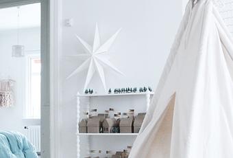 Me encanta el estilo de la decoración navideña de esta casa. En un primer momento me ha gustado el hecho de ser tan blanca, el detalle de las casitas y los pinos nevados y luego al fijarme más he visto que cada casita tiene un número y que forman un original calendario de adviento. ¡Lo quiero para mi casa!