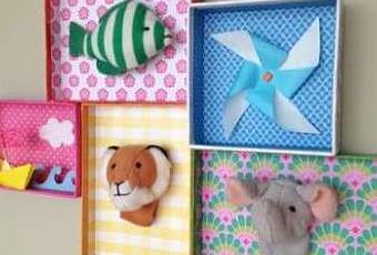 ¿Quieres decorar el cuarto con unos cuadros? No necesitas comprarlos, puedes buscar unos peluches que ya no usen, o unas manualidades hechas por los niños las tapas de cajas de cartón, y montar una maravilla como esta: