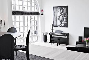 Negro en su justa medida, así ha sido utilizado el elegante color en este espacioso dúplex para crear contrastes. Los muebles en riguroso negro ocupan el espacio como si fuesen esculturas, sin quitar el protagonismo a los materiales y estructuras de construcción como los gigantescos ventanales o el cálido suelo de madera. En la cocina muebles hasta el techo y electrodomésticos en blanco, que se funden con la pared y a la vez son una perfecta solución de almacenaje.