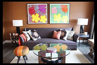 La clave está en combinar los muebles con unos cuadros de llamativas flores y unas butacas de color naranja, que le aportan al salón un toque elegante, alegre y juvenil.
