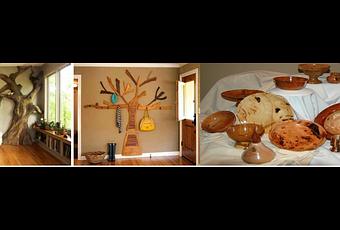 En la imagen se observa la madera presente en el hogar mediante puertas tradicionales, troncos de árboles imitando a un verdadero árbol protector o bien perchero, cestos de mimbre, mesas, estanterías, parqué en el suelo, platos y vasos,…
