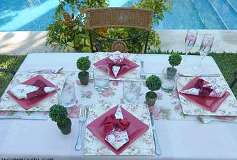 En esta decoración de mesa predominan las rosas y el rojo. Ideal, por ejemplo para una cena íntima gourmet