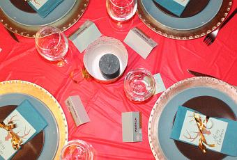 El bajo plato es de Casa, el plato turquesa, el marrón y la servilleta de Ikea. La felicitación de Navidad la descargué e imprimí de internet, obviamente la edité para darle el color de mi fiesta.