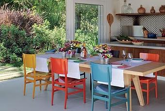 Os queremos enseñar este bonito rincón que hemos encontrado surfeando porla red. Se trata de una cocina con mesa para comer. Dicho así no tendría ninguna cosa excepcional, salvo por la alegría con la que se ha decorado este espacio. Sus dueños han decido crear una decoración muy original colocando una silla de cada color y unas flores en la mesa a juego con ellas. Simple pero efectivo.Fotografías| Casa y Jardín
