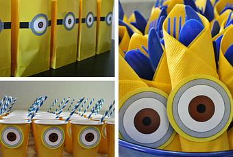 Además puedes imprimir gafas y ojos de Minions para decorar vasos, servilletas y bolsas para los invitados.