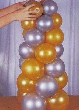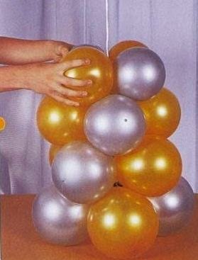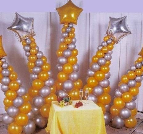 Paso a paso :Decoración para fiestas con globos 1.-Inflar los globos grandes ,2 globos dorados y 2 globos en color plata ,inflarlos del mismo tamaño,y amarrarlos . Unir con hilo nylon un cuarteto de globos,distribuye el color de la siguiente manera,un globo dorado,un globo plata ,uno dorado y plata. Usa como base un tubo delgado o un palo delgado.