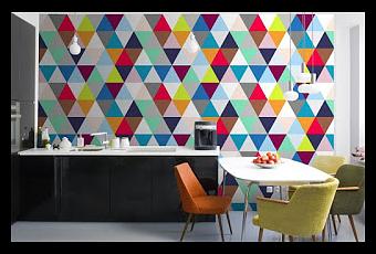 1. Papeles pintados geométricos. Si eres un fanático del orden y una ordenación estricta del espacio, tu elección puede ser un papel pintado con motivos geométricos. Con este papel también podremos dar un toque con brillantes colores a esta estancia. Un papel pintado geométrico es capaz de atraer nuestras miradas a un determinado punto de esta habitación.