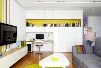Un ejemplo de las claves para la decoración en espacios pequeños lo vemos en la imagen anterior donde se usan muebles “cerrados” con gran capacidad para gran cantidad de objetos. Se prescinde de paredes, creando los distintos ambientes en pequeñas áreas a lo largo del apartamento fundamentalmente con el empleo de alfombras. Además estos muebles suelen llevar integrados distintos elementos que los hacen aptos para determinados usos. Por ejemplo, como se observa en la foto derecha, la mesa del ordenador integrada en el mueble estantería de pared o cuerpo entero. En los dormitorios es frecuente encontrar las camas con otras añadidas debajo o bien con enormes cajoneras donde guardar toda la ropa de cama, etc. En los salones o salitas de estar se ubican sofás-camas y frecuentemente se utilizan sillas que si se voltean, sirven como pequeñas escaleras para acceder a los compartimentos superiores de los muebles de pared.