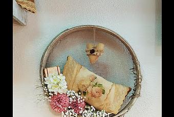 Una mano de chalk paint, unas flores (no pueden faltar) , un cojín con decoupage, arpillera, maleta.... Y así de bonita queda en el taller.