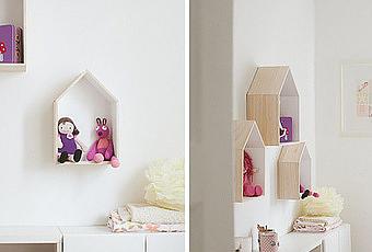 Estas casitas de madera sirven de estantería.