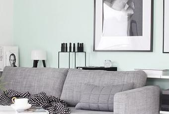 Es un tono mint suave, que contrasta a la perfección con el sofá gris jaspeado y con el resto de los detalles, como cuadros, lámparas, portavelas en color negro…