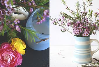 A lo que iba, ya sea que tenéis un ramo de una sola especie de flor o bien un bouquet con mezcla de diferentes flores y plantas, distribuirlos por diferentes ambientes, y veréis que bonito queda. Lo que hago es en cuando llego a casa cortarles un poco el tallo, la mayoría de veces en diagonal y muchas debajo del agua. No me digáis porque, me lo enseñaron en clases de Ikebana y desde entonces lo aplico a todas las plantas. Creo recordar que eso hace que no entre tanto aire de golpe al tallo y al estar debajo del agua no sufre tanto con el corte.