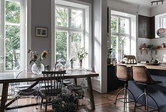 Un espacio formado por cocina, salón y zona de comedor con un aire industrial en el que no repara en detalles, con una cerámica en óxido envejecido y un azulejo metro, resaltan sobre una mobiliario de cocina en negro … más allá de esa impecable cocina blanca de líneas sencillas, tan actual y delicada, más allá de la armonía general del espacio y de los suelos grises que recuerdan aún almacén, más allá de todo eso … lo que más destaca de este espacio es la armonía en todos los elementos presentes, desde los taburetes hastas los jarrones llenos de flores. Inspírate!!!