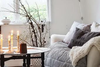 - Ubicar el sofá en un rincón del salón: lo que dará sensación de ser más acogedor.- La luz: muy importante para crear un clima envolvente, debe ser cálida, y para ellos podemos vestir nuestra mesa con varios portavelas con aspecto rústico o vintage.- Vestir la casa con textiles que aporten movimiento y sensación con confort: una alfombra calentita, una manta y varios cojines mullidos...- Para terminar creo que es importante darle a nuestro hogar un toque de naturalidad, que podemos conseguir con algún cesto de fibras naturales o un bonito jarrón decorado con ramas secas