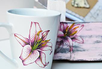 Detalle de la servilleta de flores usada para decorar una taza blanca.