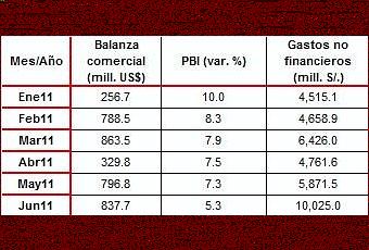 El Cuadro muestra de manera indirecta como se ha comportado la economía peruana desde los meses de Enero/2011 hasta Junio/2011. Desde el mes de Enero 2011 el Producto Bruto Interno peruano ha venido decreciendo a un promedio de -0,1 puntos porcentual cada mes. Los efectos que han influenciado en ello, han sido la disminución de la inversión pública, lo que podemos ver en el comportamiento de los gastos no financieros (Gastos Corrientes + Gastos de Capital)el mismo ha tenido un crecimiento mensual relativo hasta el mes de Marzo, en Abril, los gastos no financieros sufren una caída de mas del 26%, afectando seriamente muchos proyectos en curso, esto debido principalmente al Decreto de urgencia Nro. 012 emitido por el Gobierno de Alan García el 31 de marzo del presente año; obviamente el efecto no es inmediato y los resultados se ven en los meses siguientes afectando también a la inversión extranjera que acompaña al Estado en sus gastos. El 25 de mayo, el Congreso deroga este decreto de urgencia, dado que sus efectos eran negativos para la economía peruana; aunque muchos economistas calificados exigían al Gobierno, que controle el crecimiento excesivo mediante una reducción del gasto fiscal, muchos de ellos criticaban después al Gobierno por la emisión del decreto de urgencia Nro.012.