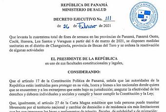Decreto No. 111 de 26 de febrero de 2021 Que levanta la cuarentena total de fines de semana en las provincias de Panamá, Panamá Oeste, Coclé, Herrera, Los Santos y Veraguas a partir del 6 de marzo de 2021.