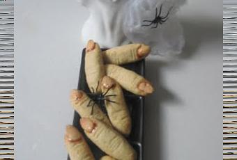 Ir precalentando el horno a 180ºC e ir cogiendo porciones igualitas y después hacer formas de dedos finitos que después se ensanchan y parecen dedos de gigante en vez de bruja, colocar una almendra en cada dedo en forma de uña presionando... y hacerles las marcas de los pliegues de los dedos....