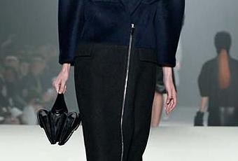 ALEXANDER WANGPropone una mujer sin formas marcadas, la silueta es prácticamente uniforme y los abrigos son bicolor azulón-negro. Los botones dan paso a las cremalleras y los materiales que emplea WANG son fuertes, cálidos y consistentes.