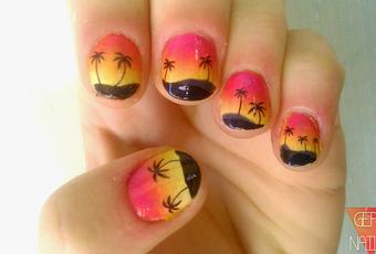 Esta manicura se trata de un degradado de rosa - naranja - amarillo, simulando el atardecer en la playa, con palmeras.Como siempre, el degradado lo he hecho con la esponjita de maquillaje. Recordar que hay que dar toques sobre la uña, moviendo un poquito arriba y abajo la esponja para que no se quede la marca entre un color y otro, si no que haya una mezcla de colores.