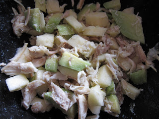 Simplemente troceamos un aguacate, una manzana ácida, el pollo de Casa Matachín en escabeche y un chorrito de aceite.Si lo picamos más pequeño tenemos un relleno de sandwich perfecto.