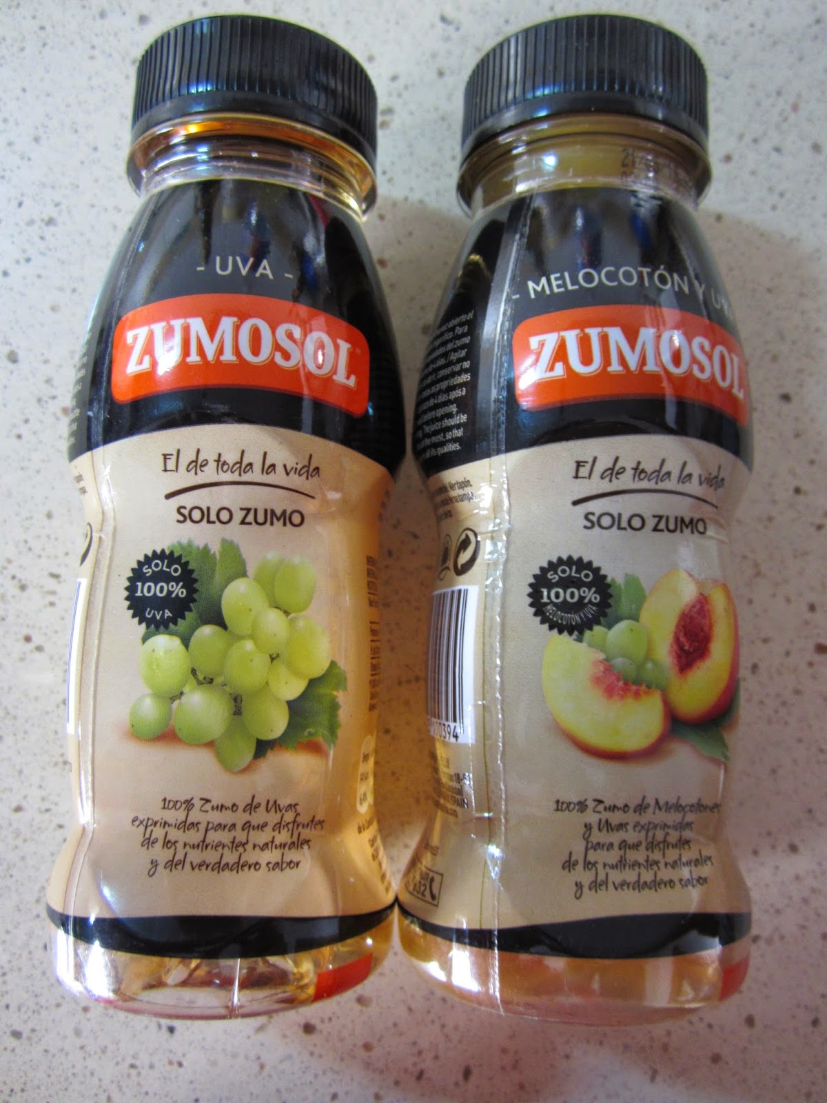 ZUMO EXPRIMIDO DE UVA Y DE MELOCOTÓN ZUMOSOLZumosol, con 20 años de experiencia en la elaboración de zumos a base de fruta de calidad, relanza sus principales líneas de producto renovando su imagen de marca, por dentro y por fuera. ¡No puedes quedarte sin probar la nueva gama de productos! Zumos 100% exprimidos para los auténticos amantes de la fruta. Energía y protección proporcionada por tu fuente de energía natural.El sabor es muy natural, parece que estás tomando un zumo de frutas recién exprimido. Gran sabor y el formato ideal para llevar al cole o de escapada. El de uva me ha encantado, sabe a uva, uva!!El de melocotón le ha gustado mucho a mis hijos.