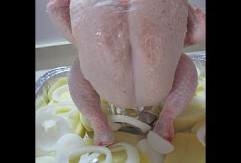 Vamos a coger uno de los botellines de Cruzcampo Cruzial que venía en nuestra caja y lo vamos a cubrir con papel de aluminio y se lo ponemos al pollo (pollos pequeños) por el culete, tranquilas que no va a sufrir.Mezclamos un poco del sazonador para pollo de Maggi con aceite de oliva y pintamos el pollo por fuera.Lo ponemos sobre una bandeja de horno con patatas y cebollas a rodajas y ponemos a asar a 180º durante 45 minutos. Pasado ese tiempo vamos a retirar con cuidado el botellín de cerveza y tenemos el pollo listo para comer.