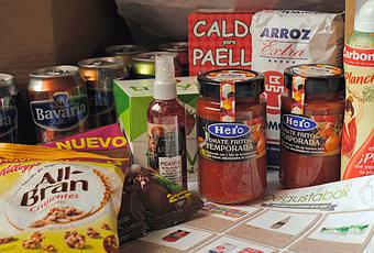 , Seis refrescos de cerveza Bavaria 0% de sabores variados frutales, un brick de caldo para paella Aneto, tres sobres de All-Bran de Kellogg's, una caja de edulcorante Truvía, un bote de aceite Carbonell en spray, un bote de sal líquida picante Fossil River, un paquete de arroz Nomen y dos botes de tomate frito de temporada Hero.