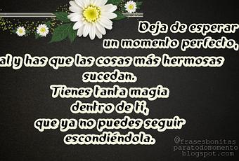 Deja de esperar un momento perfecto, sal y has que las cosas más hermosas sucedan. Tienes tanta magia dentro de ti, que ya no puedes seguir escondiéndola.