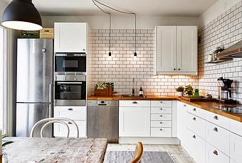 Hoy apostamos con fuerza, por esta maravillosa cocina, que no sólo me resulta TREMENDAMENTE ESTILOSA con ese aire INDUSTRIAL a la par que ROMÁNTICO que aportan las lámparas y los azulejos "TIPO METRO" en medio de una BLANCURA IMPECABLE...
