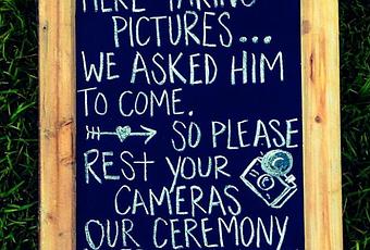 ”HAY UN CHICO AQUÍ HACIENDO FOTOS, NOSOTROS LE HEMOS PEDIDO QUE VINIESE. POR FAVOR, GUARDAD VUESTRAS CÁMARAS, NUESTRA CEREMONIA NECESITA SOLO UNA. GRACIAS, LOS RECIÉN CASADOS”