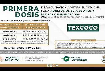 Del 29 al 21 de mayo, se aplicará en Texcoco la vacuna contra el Covid-19 a adultos de 50 a 59 años de edad y mujeres embarazadas mayores de 18 años y 9 semanas de embarazo, los que deberán de acudir a las sedes instaladas en el Deportivo Silverio Pérez y el estacionamiento de Gran Patio, en donde de acuerdo a la primera letra de su apellido se les aplicará la dosis correspondiente.