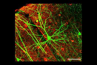 Un tipo de neurona, llamada piramidal, marcada con proteína fluorescente verde.