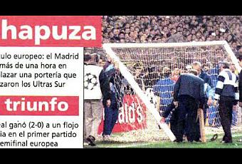 "Un centenar de Ultras Sur encaramados a la valla metálica que separaba el terreno de juego de la grada se vieron (y alguno se debió dar) de bruces en el suelo cuando ésta -la valla- empezó a doblarse y ceder hacia atrás, derribando consigo la portería que en esa primera parte de encuentro iba a defender Bodo Illgner,y que, inexplicablemente, estaba atada con cables al soporte metálico que separaba ambos espacios del estadio. El percal no había hecho nada más que empezar:los operarios del club intentaron, sin éxito, restablecer la portería, por lo que se decidió arrancarla del todo, retirarla, y usar la de recambio, El problema? no había portería de recambio(incumpliendo, así, una normativa de la UEFA, lo que le acabó costando a los blancos una multa de 115 millones de pesetas de la época -691.163€-, y un partido de suspensión).A partir de aquí, el despropósito empezó a hacerse sangrante: se decidió ir a la Ciudad Deportiva, a dos kilómetros del campo, a buscar una portería. Una vez allí, no había nadie en las instalaciones (todos los empleados estaban en el Bernabéu), por lo que Agustín Herrerín, ayudante de Casabella, entonces delegado del Madrid, decidió saltar la oxidada valla de seguridad, rompiéndose los pantalones, y, por poco, algo más sensible. Dentro, se encontró a un camionero cenando, y le propuso pagarle “lo que sea” (al parecer, fueron 85.000 pesetas -510 €-) para que ambos llevaran la portería al estadio. Éste aceptó, pero había que superar otra valla más (Herrerín debió soñar con vallas esa noche), que el camionero derribó con su vehículo.Sin obstáculos de por medio, subieron una portería de entrenamiento al camión, y salieron pitando hacia Concha Espina.Mientras todo esto sucedía, los alemanes presionaban, sin resultado, al árbitro del partido, el holandés Mario Van Der Ende, para que suspendiera el partido (días más tarde, incluso reclamarían que le dieran el partido ganado por 0 a 3 debido al incidente). A las 21:45, la portería de recambio entraba al campo, donde, debido a su naturaleza, tuvo que ser atada y fijada por todos lados (cuentan que, antes, Van Der Ende comprobó la estabilidad del marco con un golpe, tras el cual éste se tambaleó). A las 22:01, una hora y cuarto después de la hora oficial (en el partido Bulgaria-Alemania del mundial de fútbol de 1994 se reemplazó una portería en seis minutos), se inició el partido,que acabó ganando el Madrid por 2 a 0, con tantos de Morientes y Karembeu"