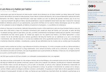 Vicente Luis tiene un blog que os recomiendo, dedicado básicamente al i-pod y al libro electrónico, pero en el que también habla a veces de literatura. Hace años solía entrar y dejar mis ilustrados comentarios pero acabé por dejar de hacerlo [...] De vez en cuando vuelvo a entrar en su blog y sigo hallando en él motivos de regocijo. Os invito a compartir una de sus últimas entradas y mi contestación, que espero que colgará en su blog noblemente, como siempre ha hecho. Confío en no contravenir, al colgar su texto, ninguna ley de derechos de autor (al contrario, creo que él agradecerá que su pensamiento se difunda). Si fuera así, me corregiré al primer aviso. Ahí va su post y a continuación mi respuesta [...] Seguimos, amigo Vicente, incurriendo en los mismos vicios que te invalidan como crítico riguroso, salvo para la tropa aquiescente, que siempre estará ahí, fiel y guerrera. El asunto se parece mucho a lo de "la poesía actual...". Ahora es "la crítica actual...". Habría que empezar por lo básico: ¿qué crítica actual, qué críticos, dónde están los ejemplos? Claro que esas abusivas generalizaciones convienen a tus lectores, los cuales, quien más quien menos (¿se acentúa el "quien" en este caso? Me surge la duda. Yo creo que no), tiene una deuda que saldar con algún crítico y le viene de perlas.