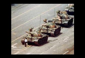 Un muchacho chino le ofrece a un poderoso tanque de la misma nacionalidad su escuálida anatomía como pasto a su terrible potencia y la bestia supermortífera se detiene.