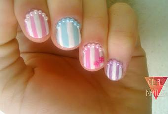 Es una manicura, en 3 colores (moradito, rosita y azul). Puse dos capas de cada esmalte, y cuando estaba seco, hice rayas blancas verticales.