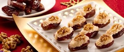 16 Dátiles medianos. 8 Nueces. 100 gr. de Mascarpone 1 cucharadita de Canela en polvo 1 cucharadita de azúcar.Preparación:Colocar en un recipiente el azúcar y el mascarpone, amalgamar hasta obtener una crema uniforme. Añadir el resto de ingredientes y mezclar bien hasta fusionar. Abrir los dátiles cortándolos a la mitad sin despegarlos de un lado para poder posteriormente rellenarlos. En el caso que tengan semilla, retirarlas y rellenar con la crema obtenida con la ayuda de una cuchara pequeña o una manga de repostería. Colocar los dátiles en un plato llano y decorarlos con una nuez al centro.Dejar reposar en la nevera de 3-4h antes de servirlos.