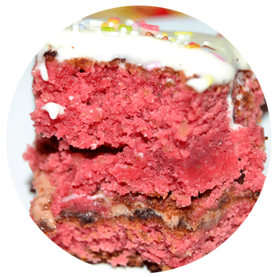 · Una vez esté el bizcocho frío lo desmoldamos y lo cortamos por la mitad. Lo rellenamos con el frosting, volvemos a juntar sin apretar y extendemos todo lo que nos queda del frosting por toda la tarta. Le añadimos algo por encima -yo le puse virutas de colores y corazones- para decorar y a servir.