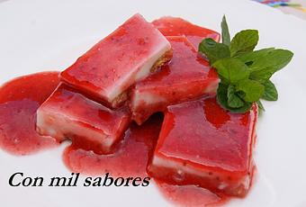 No, que no me he cargado a nadie!!.Es que el otro día hice mermelada de fresas, aunque más bien me salió un coulis, pero está igualmente bueno, y tiene un color tan rojo que cada vez que la pongo en un plato parece que hemos rodado la segunda parte de "La matanza de Texas". Hija mía, que color más intenso tienen la fresas este año!!!!!. Si en lugar de ser frutas primaverales las hubiese tenido para Hallowen me hubiese ahorrado este año un montón de dinero en el disfraz de Zombie. Bueno como os decía (que al momento me voy por las ramas), que con la mermelada-coulis de fresas he preparado un montón de recetas ricas, entre ellas estas delicias de cuajada que son un bocado muy bueno. Y digo bocado pues las corté y presenté en porciones pequeñas para tomarlas de una sola pieza.Ingredientes:Medio lilro de leche.Medio litro de nata para cocinar.Seis cucharadas de azúcar.Dos sobre de cuajada.Unas galletas tipo María para la baseMermelada para cubrir.