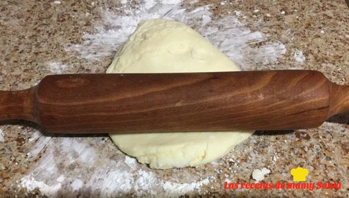 Pasamos a la mesa de trabajo espolvoreada con un poco de harina y aplanamos con un rodillo