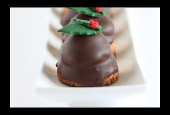 150 g de chocolate (oscuro) 10 macarrones crema de mantequilla en el sabor de elección 1 bolso de los pasteles un pedazo de verde y rojo mazapán o pasta de azúcar Cortador de hoja de acebo rodillo plato resistente al calor placa