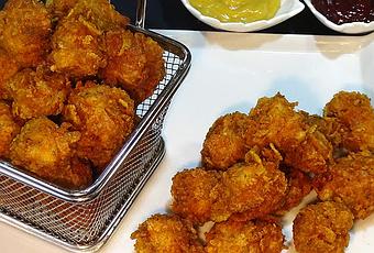 Pasado las horas de marinado del pollo, pondremos los copos de maíz tostado en un recipiente amplio y los rompemos con las manos, pasamos cada trozo de pollo por la harina con especias y después los pasamos otra vez por la mezcla del marinado, los pasamos al recipiente con los copos de maíz y apretamos con las manos para que queden bien adheridos, los dejamos en una bandeja y cuando ya los tengamos todos bien rebozados ponemos abundante aceite a calentar, cuando este caliente pero no en exceso freímos durante unos minutos hasta que estén bien dorados y después los dejamos sobre papel absorbente, ya solo nos queda emplatar y acompañar de alguna salsa de nuestra preferencia y a disfrutar. ¡¡Probadlo os va a encantar!!
