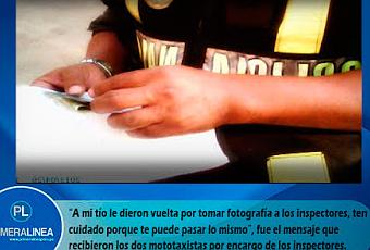 “A mi tío le dieron vuelta por tomar fotografía a los inspectores, ten cuidado porque te puede pasar lo mismo”, fue el mensaje que recibieron los dos mototaxistas por encargo de los inspectores.Por ultimo no dejaron de expresar su sorpresa por la negativa de la Subprefectura de la zona para otorgarles las garantías de ley a pesar de haber presentado los medios probatorios.“Presentamos los nombres de las personas más las fotografías, pero nos negaron este derecho”, acotaron.