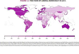El anuario de V-dem, también sitúa a España entre las democracias plenas, en el mapamundi, el color oscuro serían las mejores, las más democráticas mientras los países situados con el color claro serían los menos democráticos. En las tablas de scores, se aprecia una penalización que rebaja la calificación española por el componente electoral en la que obtiene su peor nota. En cualquier caso volvemos a ver situada la democracia española entre los eslabones de arriba de la cadena.