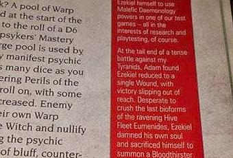 El ver esta imagen imagen filtrada,sacada de L'Astropate y de un grupo de FB por cierto,de la WDW ha hecho que me vea obligado a saltarme una norma que yo mismo me había auto-impuesto y es la de no opinar de la 7ª edición de W40K hasta que tuviera algo solido que me animara a hacerlo,como por ejemplo un ejemplar del reglamento.Pero si lo que cuentan en esa columna de la WDW es cierto y esta integrado realmente como regla oficial del juego,personalmente me parece una aberración.Al parecer,quieren incluir una especie de disciplina universal que vendría ser Demonología ,por el cual se pueden invocar demonios en tu ejército aunque no juegues ni con MEC ni con Demonios del caos.Algo por el estilo a lo de las criaturas vinculadas de Tormenta de Magia de WFB,pero en vez de en un suplemento como parte de las reglas.Aunque con la boca(Bueno,los dedos) digo que no me quiero creer que algo así se este haciendo realidad,en mi interior se que esto seguramente sea ya una realidad.Visto la evolución del juego en los últimos años,esta era una de las pocas cosas que les quedaban por hacer a los GW.Al parecer ya no les vale el tema de los Aliados,si no que si esto se cumple irán un paso mas allá y sacaran "figuras comodín"que todo el mundo o casi todo el mundo podrá usar.Y ahí tenemos un ejemplo de Ezekiel,todo un miembro del Circulo Interior de los AO,dejándose poseer por un Devorador de Almas para poder acabar con los Tiranidos.Exitus acta probat.Y quien dice Ezekiel,puede hablar de un Tigurius,un Mephiston,...creo que no tengo que seguir.