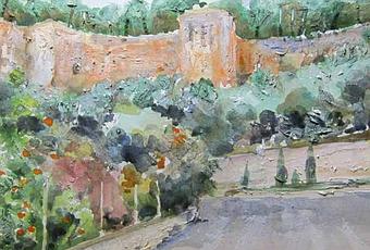 El castillo de Denia es inmenso y visto desde cualquier lugar da tema para pintar. En este caso es una acuarela que he hecho ya en casa. El papel es satinado, de Arches y los colores y pinceles, los de costumbre, de Daniel Smith y de Escoda. Llevo un par de días haciendo probaturas con pasta de papel para dar relieve y textura a las acuarelas. En principio se me ocurrió que para los troncos de los árboles iría bien, pues permite aplicar la pasta y hacer rayaduras antes de que se haga de una pieza. Luego, al usar la acuarela, sobre todo si es un pigmento que sedimenta mucho, el color se deposita en unos lugares y se frena en otros, con lo que se resaltan esas líneas que antes habíamos hecho. Visto con luz lateral, como en la foto, parecen pinceladas con óleo y mucha carga. Como una cosa lleva a otra, resulta que acabamos haciendo una acuarela con textura de óleo, aprovechando una foto del castillo de Denia. No sé si merece la pena o si, ya puestos, convendría usar óleo directamente. Hace mil años que prefiero la acuarela, por su transparencia, por lo sencillo de los materiales, por usar papel como soporte, por lo fácil de la limpieza y por que no me gusta como huele el aguarrás. Como experimento está bien. Seguramente seguiré utilizando el sistema para los árboles, intentando depurar esa técnica, pero no descarto volver a trabajar más en serio este sistema al que he llegado de casualidad. Por lo pronto me gusta, sobre todo porque invita a dar otra clase de pinceladas y trabajar con manchas y poco detalle. Veremos.